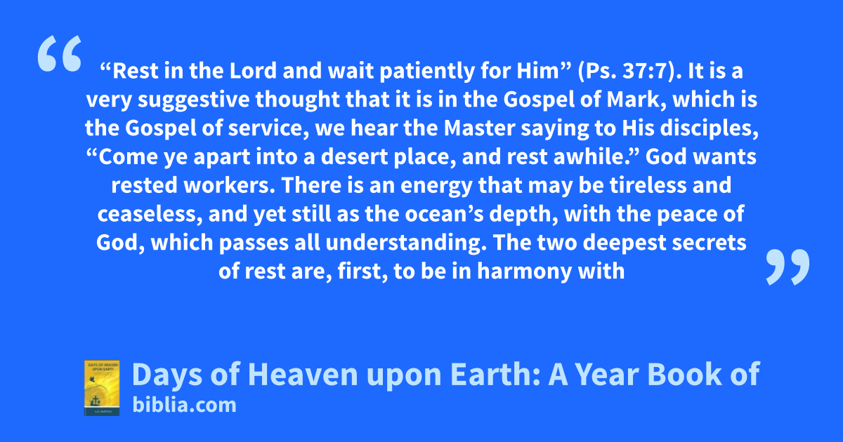 “Rest in the Lord and wait patiently for Him” (Ps. 37:7). It is a very suggestive thought that it is in the Gospel of Mark, which is the Gospel of service, we hear the Master saying to His disciples, “Come ye apart into a desert place, and rest awhile.” God wants rested workers. There is an energy that may be tireless and ceaseless, and yet still as the ocean’s depth, with the peace of God, which passes all understanding. The two deepest secrets of rest are, first, to be in harmony with