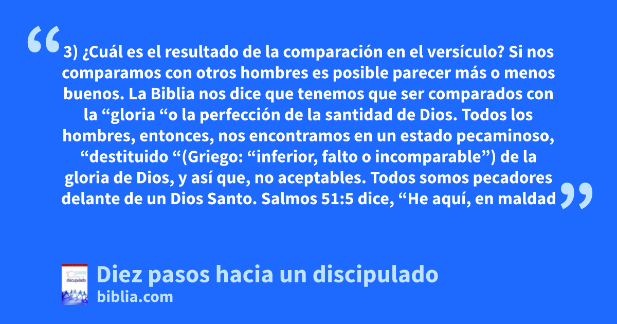 3) ¿Cuál es el resultado de la comparación en el versículo? Si nos comparamos con otros hombres es posible parecer más o menos buenos. La Biblia nos dice que tenemos que ser comparados con la “gloria “o la perfección de la santidad de Dios. Todos los hombres, entonces, nos encontramos en un estado pecaminoso, “destituido “(Griego: “inferior, falto o incomparable”) de la gloria de Dios, y así que, no aceptables. Todos somos pecadores delante de un Dios Santo. Salmos 51:5 dice, “He aquí, en maldad