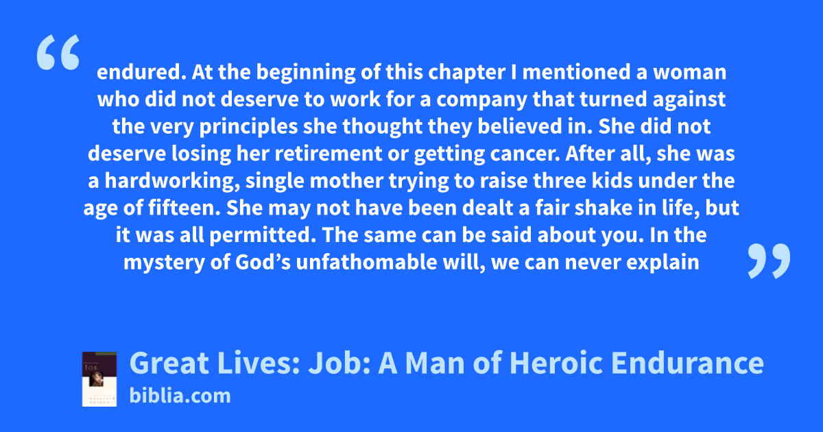endured. At the beginning of this chapter I mentioned a woman who did not deserve to work for a company that turned against the very principles she thought they believed in. She did not deserve losing her retirement or getting cancer. After all, she was a hardworking, single mother trying to raise three kids under the age of fifteen. She may not have been dealt a fair shake in life, but it was all permitted. The same can be said about you. In the mystery of God’s unfathomable will, we can never explain