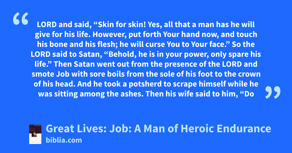 LORD and said, “Skin for skin! Yes, all that a man has he will give for his life. However, put forth Your hand now, and touch his bone and his flesh; he will curse You to Your face.” So the LORD said to Satan, “Behold, he is in your power, only spare his life.” Then Satan went out from the presence of the LORD and smote Job with sore boils from the sole of his foot to the crown of his head. And he took a potsherd to scrape himself while he was sitting among the ashes. Then his wife said to him, “Do