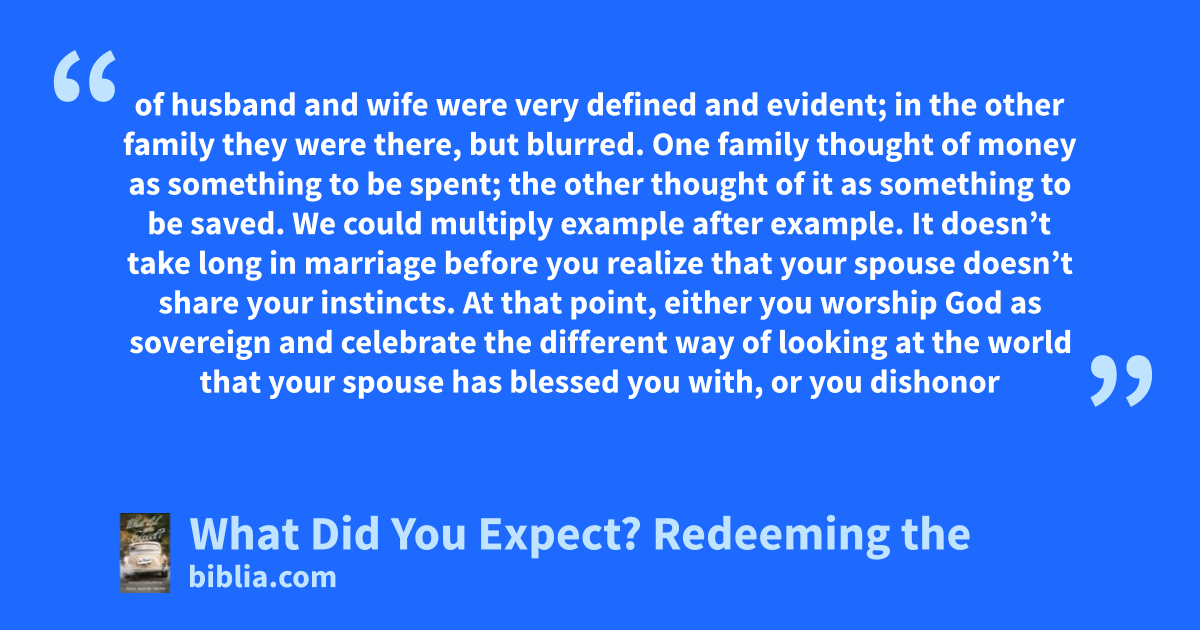 of husband and wife were very defined and evident; in the other family they were there, but blurred. One family thought of money as something to be spent; the other thought of it as something to be saved. We could multiply example after example. It doesn’t take long in marriage before you realize that your spouse doesn’t share your instincts. At that point, either you worship God as sovereign and celebrate the different way of looking at the world that your spouse has blessed you with, or you dishonor