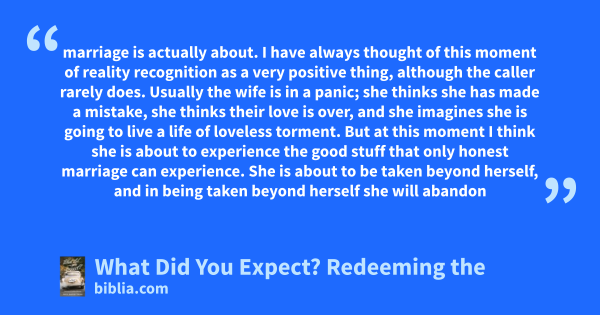 marriage is actually about. I have always thought of this moment of reality recognition as a very positive thing, although the caller rarely does. Usually the wife is in a panic; she thinks she has made a mistake, she thinks their love is over, and she imagines she is going to live a life of loveless torment. But at this moment I think she is about to experience the good stuff that only honest marriage can experience. She is about to be taken beyond herself, and in being taken beyond herself she will abandon