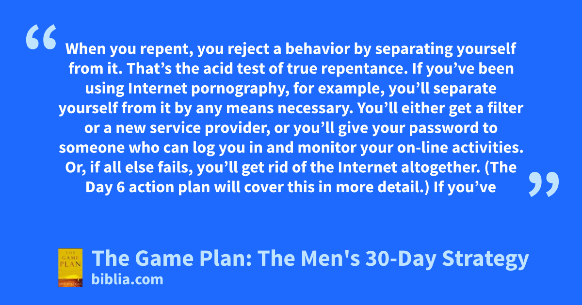 When you repent, you reject a behavior by separating yourself from it. That’s the acid test of true repentance. If you’ve been using Internet pornography, for example, you’ll separate yourself from it by any means necessary. You’ll either get a filter or a new service provider, or you’ll give your password to someone who can log you in and monitor your on-line activities. Or, if all else fails, you’ll get rid of the Internet altogether. (The Day 6 action plan will cover this in more detail.) If you’ve