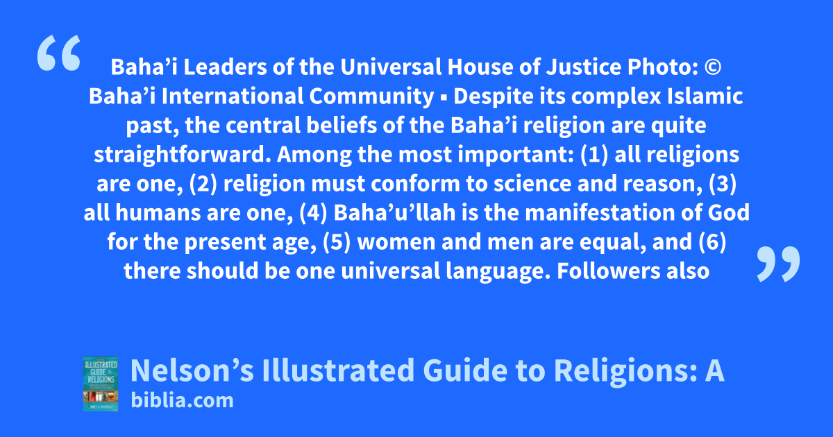 Baha’i Leaders of the Universal House of Justice Photo: © Baha’i International Community ■ Despite its complex Islamic past, the central beliefs of the Baha’i religion are quite straightforward. Among the most important: (1) all religions are one, (2) religion must conform to science and reason, (3) all humans are one, (4) Baha’u’llah is the manifestation of God for the present age, (5) women and men are equal, and (6) there should be one universal language. Followers also