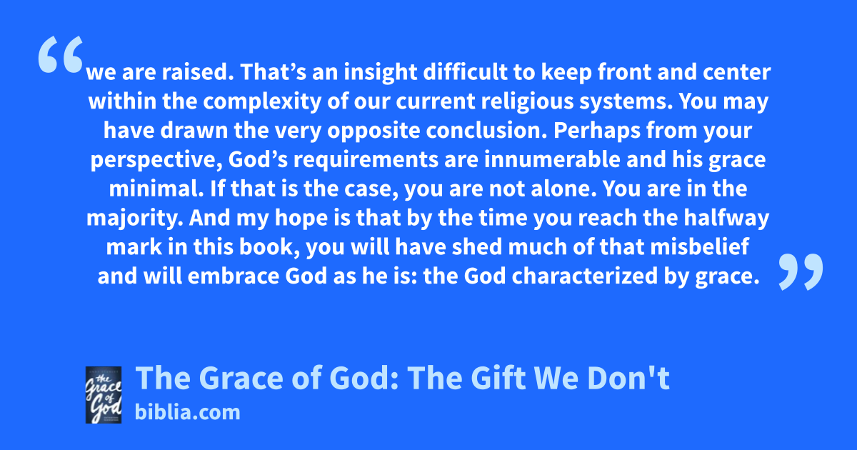 we are raised. That’s an insight difficult to keep front and center within the complexity of our current religious systems. You may have drawn the very opposite conclusion. Perhaps from your perspective, God’s requirements are innumerable and his grace minimal. If that is the case, you are not alone. You are in the majority. And my hope is that by the time you reach the halfway mark in this book, you will have shed much of that misbelief and will embrace God as he is: the God characterized by grace.