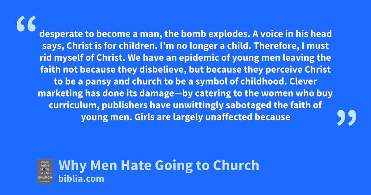 desperate to become a man, the bomb explodes. A voice in his head says, Christ is for children. I’m no longer a child. Therefore, I must rid myself of Christ. We have an epidemic of young men leaving the faith not because they disbelieve, but because they perceive Christ to be a pansy and church to be a symbol of childhood. Clever marketing has done its damage—by catering to the women who buy curriculum, publishers have unwittingly sabotaged the faith of young men. Girls are largely unaffected because