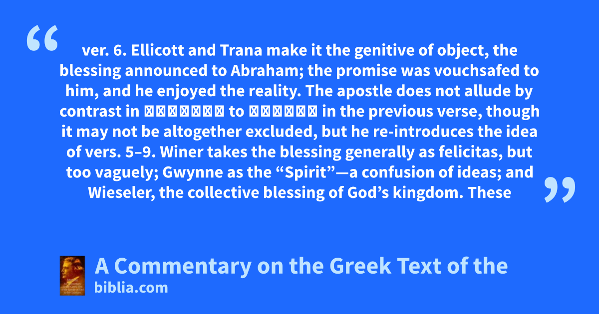ver. 6. Ellicott and Trana make it the genitive of object, the blessing announced to Abraham; the promise was vouchsafed to him, and he enjoyed the reality. The apostle does not allude by contrast in εὐλογία to κατάρα in the previous verse, though it may not be altogether excluded, but he re-introduces the idea of vers. 5–9. Winer takes the blessing generally as felicitas, but too vaguely; Gwynne as the “Spirit”—a confusion of ideas; and Wieseler, the collective blessing of God’s kingdom. These