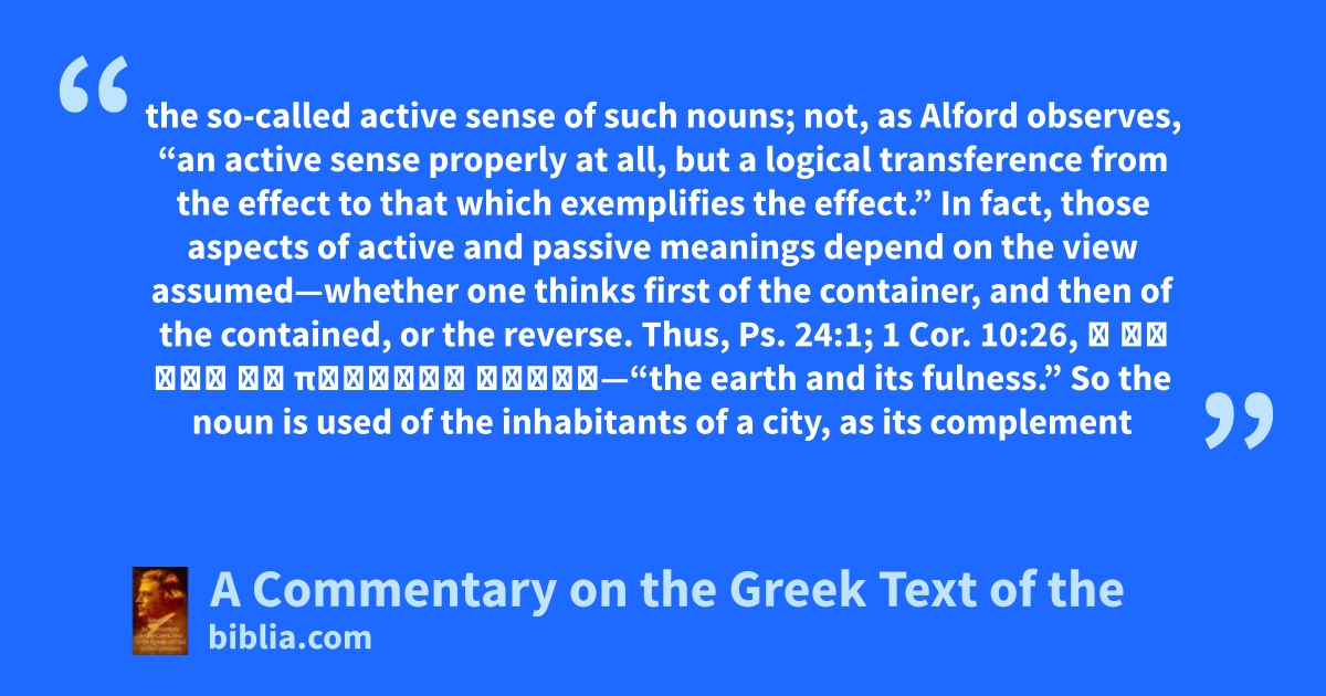 the so-called active sense of such nouns; not, as Alford observes, “an active sense properly at all, but a logical transference from the effect to that which exemplifies the effect.” In fact, those aspects of active and passive meanings depend on the view assumed—whether one thinks first of the container, and then of the contained, or the reverse. Thus, Ps. 24:1; 1 Cor. 10:26, ἡ γῆ καὶ τὸ πλήρωμα αὐτῆς—“the earth and its fulness.” So the noun is used of the inhabitants of a city, as its complement