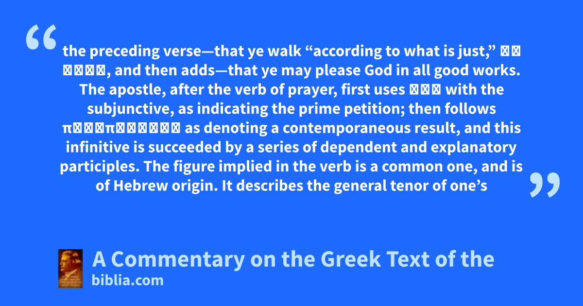 the preceding verse—that ye walk “according to what is just,” ܐܟ ܪܙܪܩ, and then adds—that ye may please God in all good works. The apostle, after the verb of prayer, first uses ἵνα with the subjunctive, as indicating the prime petition; then follows περιπατῆσαι as denoting a contemporaneous result, and this infinitive is succeeded by a series of dependent and explanatory participles. The figure implied in the verb is a common one, and is of Hebrew origin. It describes the general tenor of one’s