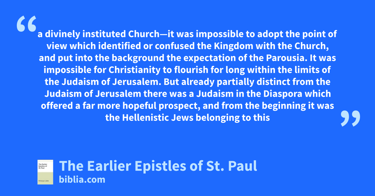 a divinely instituted Church—it was impossible to adopt the point of view which identified or confused the Kingdom with the Church, and put into the background the expectation of the Parousia. It was impossible for Christianity to flourish for long within the limits of the Judaism of Jerusalem. But already partially distinct from the Judaism of Jerusalem there was a Judaism in the Diaspora which offered a far more hopeful prospect, and from the beginning it was the Hellenistic Jews belonging to this