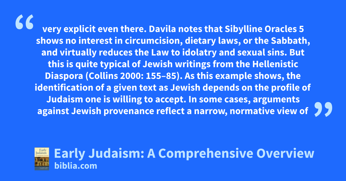 very explicit even there. Davila notes that Sibylline Oracles 5 shows no interest in circumcision, dietary laws, or the Sabbath, and virtually reduces the Law to idolatry and sexual sins. But this is quite typical of Jewish writings from the Hellenistic Diaspora (Collins 2000: 155–85). As this example shows, the identification of a given text as Jewish depends on the profile of Judaism one is willing to accept. In some cases, arguments against Jewish provenance reflect a narrow, normative view of