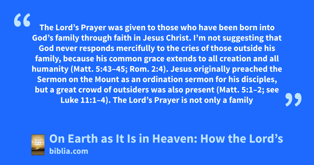 The Lord’s Prayer was given to those who have been born into God’s family through faith in Jesus Christ. I’m not suggesting that God never responds mercifully to the cries of those outside his family, because his common grace extends to all creation and all humanity (Matt. 5:43–45; Rom. 2:4). Jesus originally preached the Sermon on the Mount as an ordination sermon for his disciples, but a great crowd of outsiders was also present (Matt. 5:1–2; see Luke 11:1–4). The Lord’s Prayer is not only a family