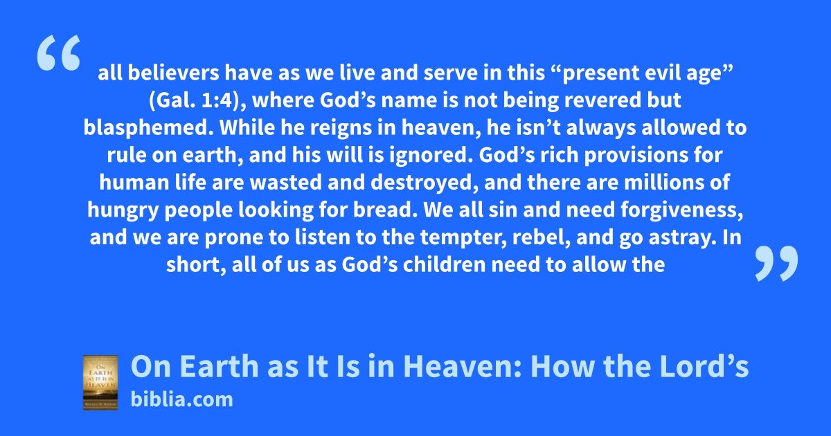 all believers have as we live and serve in this “present evil age” (Gal. 1:4), where God’s name is not being revered but blasphemed. While he reigns in heaven, he isn’t always allowed to rule on earth, and his will is ignored. God’s rich provisions for human life are wasted and destroyed, and there are millions of hungry people looking for bread. We all sin and need forgiveness, and we are prone to listen to the tempter, rebel, and go astray. In short, all of us as God’s children need to allow the