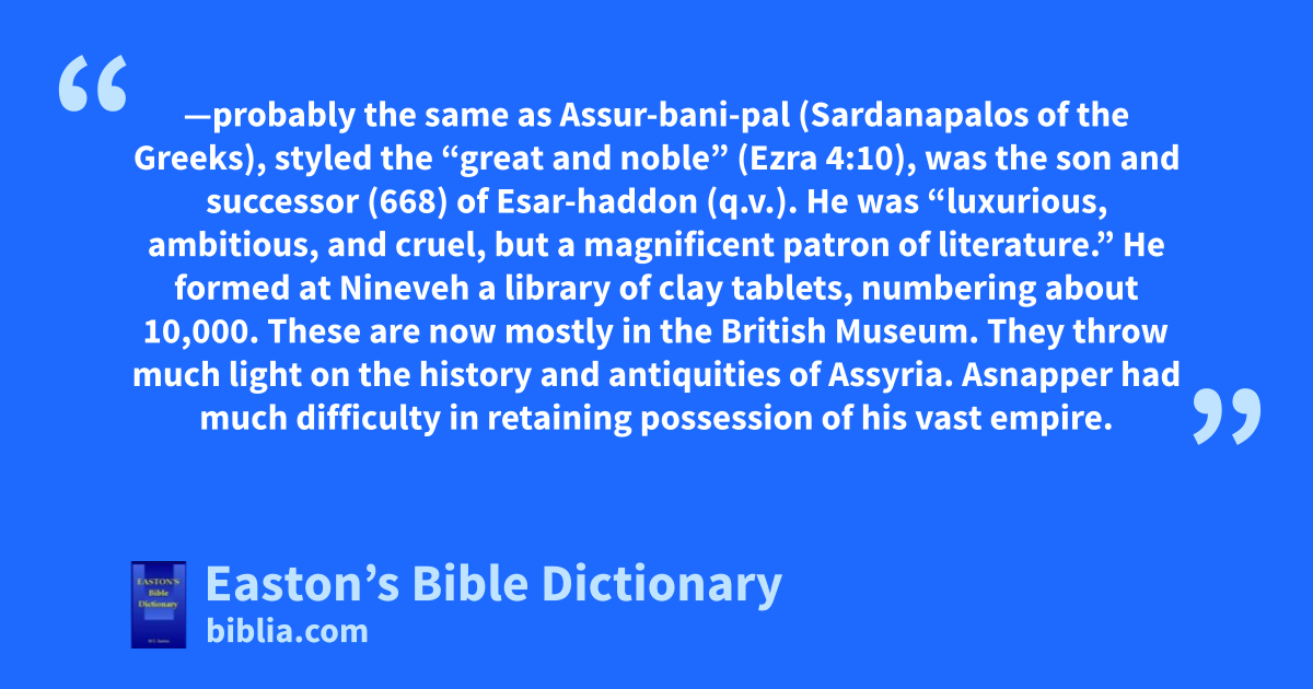 Asnapper—probably the same as Assur-bani-pal (Sardanapalos of the Greeks), styled the “great and noble” (Ezra 4:10), was the son and successor (668) of Esar-haddon (q.v.). He was “luxurious, ambitious, and cruel, but a magnificent patron of literature.” He formed at Nineveh a library of clay tablets, numbering about 10,000. These are now mostly in the British Museum. They throw much light on the history and antiquities of Assyria.