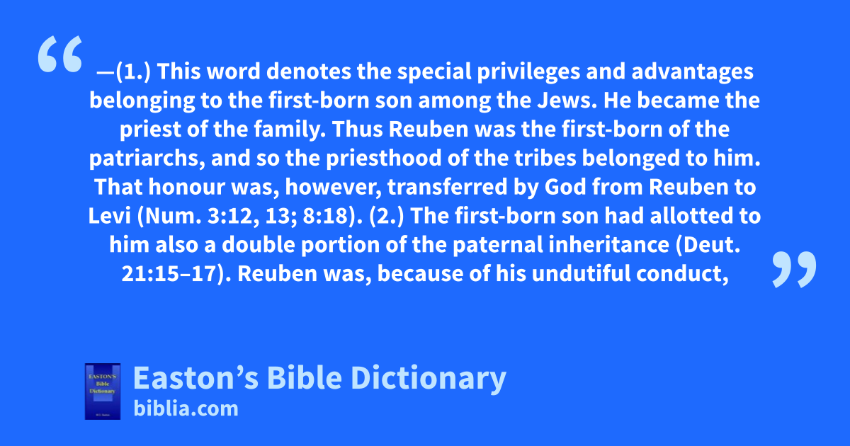 Birthright—(1.) This word denotes the special privileges and advantages belonging to the first-born son among the Jews. He became the priest of the family. Thus Reuben was the first-born of the patriarchs, and so the priesthood of the tribes belonged to him. That honour was, however, transferred by God from Reuben to Levi (Num. 3:12, 13; 8:18).