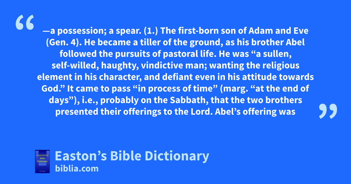 Cain—a possession; a spear. (1.) The first-born son of Adam and Eve (Gen. 4). He became a tiller of the ground, as his brother Abel followed the pursuits of pastoral life. He was “a sullen, self-willed, haughty, vindictive man; wanting the religious element in his character, and defiant even in his attitude towards God.” It came to pass “in process of time” (marg. “at the end of days”), i.e., probably on the Sabbath, that the two brothers presented their offerings to the Lord. Abel’s offering was of the “firstlings of his flock and of the fat,” while Cain’s was “of the fruit of the ground.” Abel’s sacrifice was “more excellent” (Heb. 11:4) than Cain’s, and was accepted by God. On this account Cain was “very wroth,” and cherished feelings of murderous hatred against his brother, and was at length guilty of the desperate outrage of putting him to death (1 John 3:12). For this crime he was expelled from Eden, and henceforth led the life of an exile, bearing upon him some mark which God had set upon him in answer to his own cry for mercy, so that thereby he might be protected from the wrath of his fellow-men; or it may be that God only gave him some sign to assure him that he would not be slain (Gen. 4:15). Doomed to be a wanderer and a fugitive in the earth, he went forth into the “land of Nod”, i.e., the land of “exile”, which is said to have been in the “east of Eden,” and there he built a city, the first we read of, and called it after his son’s name, Enoch. His descendants are enumerated to the sixth generation. They gradually degenerated in their moral and spiritual condition till they became wholly corrupt before God. This corruption prevailed, and at length the Deluge was sent by God to prevent the final triumph of evil. (See ABEL.)