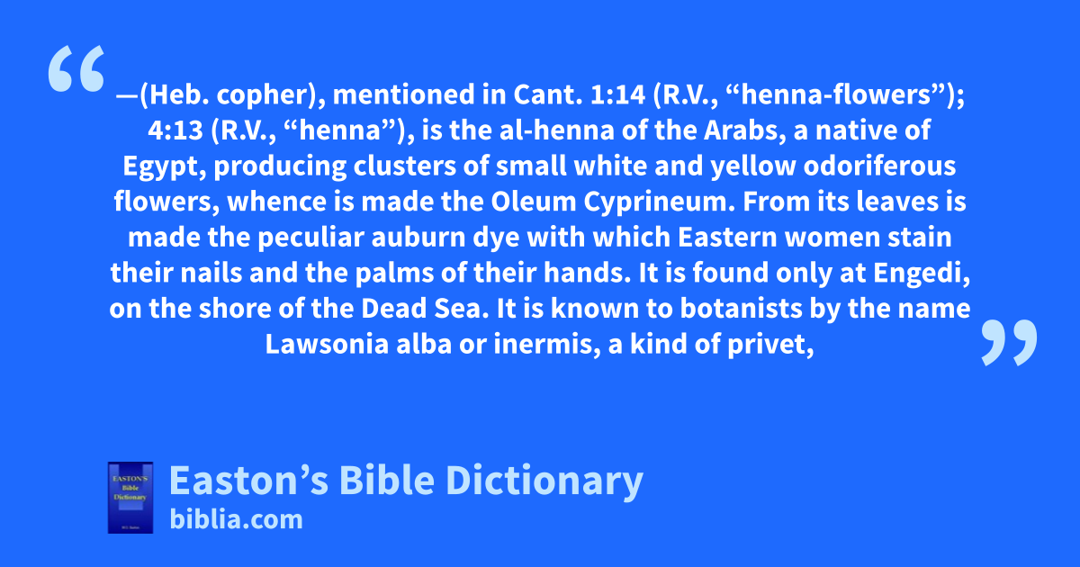 Camphire—(Heb. copher), mentioned in Cant. 1:14 (R.V., “henna-flowers”); 4:13 (R.V., “henna”), is the al-henna of the Arabs, a native of Egypt, producing clusters of small white and yellow odoriferous flowers, whence is made the Oleum Cyprineum. From its leaves is made the peculiar auburn dye with which Eastern women stain their nails and the palms of their hands. It is found only at Engedi, on the shore of the Dead Sea. It is known to botanists by the name Lawsonia alba or inermis, a kind of privet, which grows 6 or 8 feet high. The margin of the Authorized Version of the passages above referred to has “or cypress,” not with reference to the conifer so called, but to the circumstance that one of the most highly appreciated species of this plant grew in the island of Cyprus.