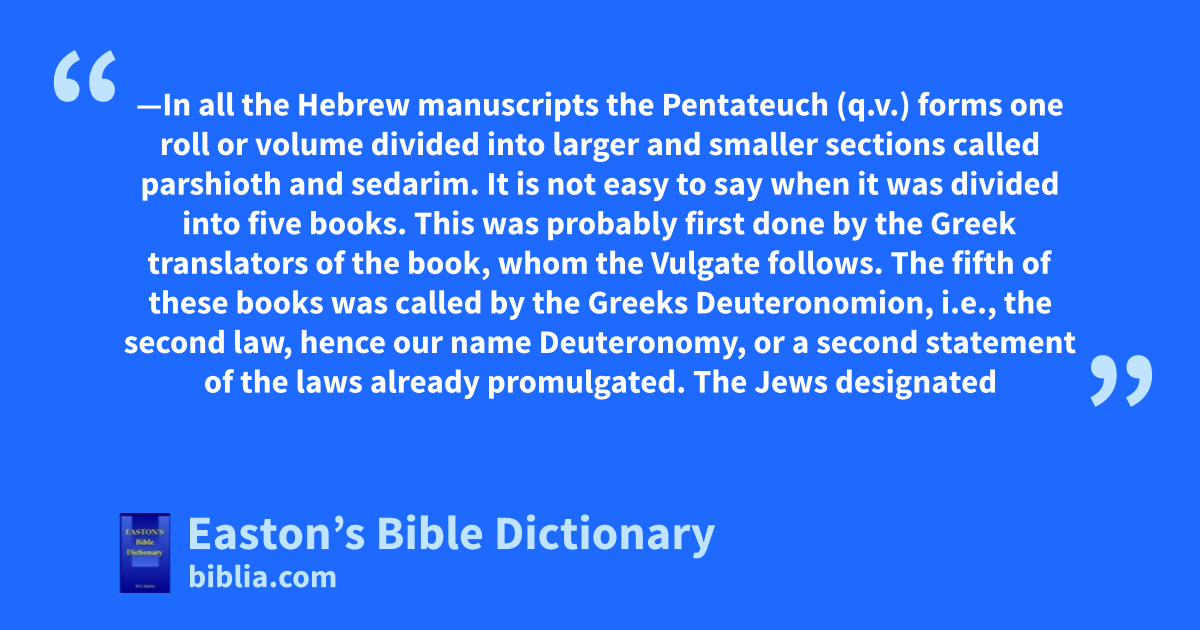 Deuteronomy—In all the Hebrew manuscripts the Pentateuch (q.v.) forms one roll or volume divided into larger and smaller sections called parshioth and sedarim. It is not easy to say when it was divided into five books. This was probably first done by the Greek translators of the book, whom the Vulgate follows. The fifth of these books was called by the Greeks Deuteronomion, i.e., the second law, hence our name Deuteronomy, or a second statement of the laws already promulgated. The Jews designated the book by the two first Hebrew words that occur, ‘Elle haddabharim, i.e., “These are the words.” They divided it into eleven parshioth. In the English Bible it contains thirty-four chapters.
