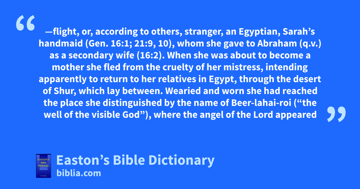 Hagar—flight, or, according to others, stranger, an Egyptian, Sarah’s handmaid (Gen. 16:1; 21:9, 10), whom she gave to Abraham (q.v.) as a secondary wife (16:2). When she was about to become a mother she fled from the cruelty of her mistress, intending apparently to return to her relatives in Egypt, through the desert of Shur, which lay between. Wearied and worn she had reached the place she distinguished by the name of Beer-lahai-roi (“the well of the visible God”), where the angel of the Lord appeared to her. In obedience to the heavenly visitor she returned to the tent of Abraham, where her son Ishmael was born, and where she remained (16) till after the birth of Isaac, the space of fourteen years. Sarah after this began to vent her dissatisfaction both on Hagar and her child. Ishmael’s conduct was insulting to Sarah, and she insisted that he and his mother should be dismissed. This was accordingly done, although with reluctance on the part of Abraham (Gen. 21:14). They wandered out into the wilderness, where Ishmael, exhausted with his journey and faint from thirst, seemed about to die. Hagar “lifted up her voice and wept,” and the angel of the Lord, as before, appeared unto her, and she was comforted and delivered out of her distresses (Gen. 21:18, 19).