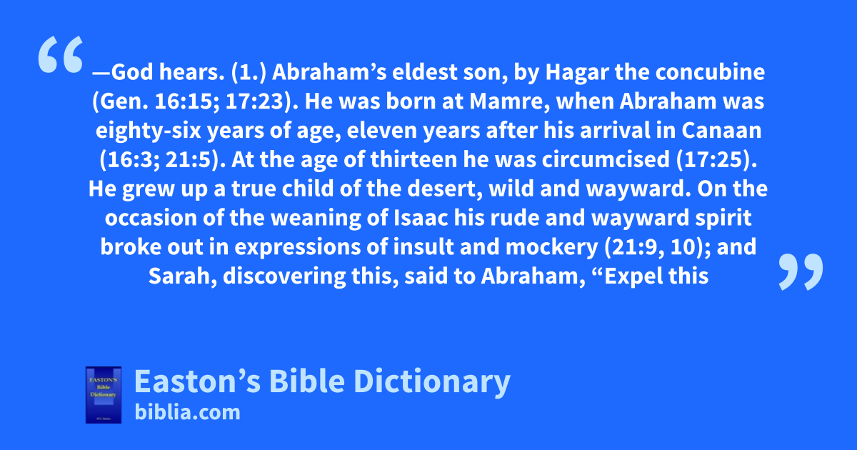 Ishmael—God hears. (1.) Abraham’s eldest son, by Hagar the concubine (Gen. 16:15; 17:23). He was born at Mamre, when Abraham was eighty-six years of age, eleven years after his arrival in Canaan (16:3; 21:5). At the age of thirteen he was circumcised (17:25). He grew up a true child of the desert, wild and wayward. On the occasion of the weaning of Isaac his rude and wayward spirit broke out in expressions of insult and mockery (21:9, 10); and Sarah, discovering this, said to Abraham, “Expel this slave and her son.” Influenced by a divine admonition, Abraham dismissed Hagar and her son with no more than a skin of water and some bread. The narrative describing this act is one of the most beautiful and touching incidents of patriarchal life (Gen. 21:14–16). (See HAGAR.)