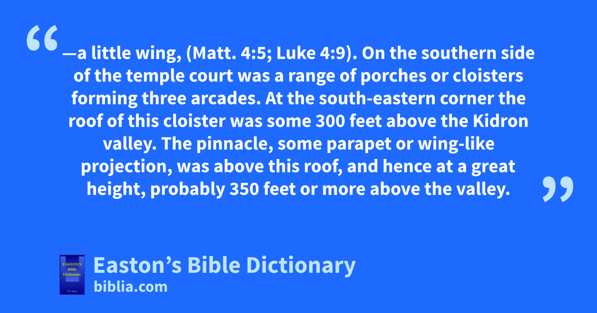 Pinnacle—a little wing, (Matt. 4:5; Luke 4:9). On the southern side of the temple court was a range of porches or cloisters forming three arcades. At the south-eastern corner the roof of this cloister was some 300 feet above the Kidron valley. The pinnacle, some parapet or wing-like projection, was above this roof, and hence at a great height, probably 350 feet or more above the valley.