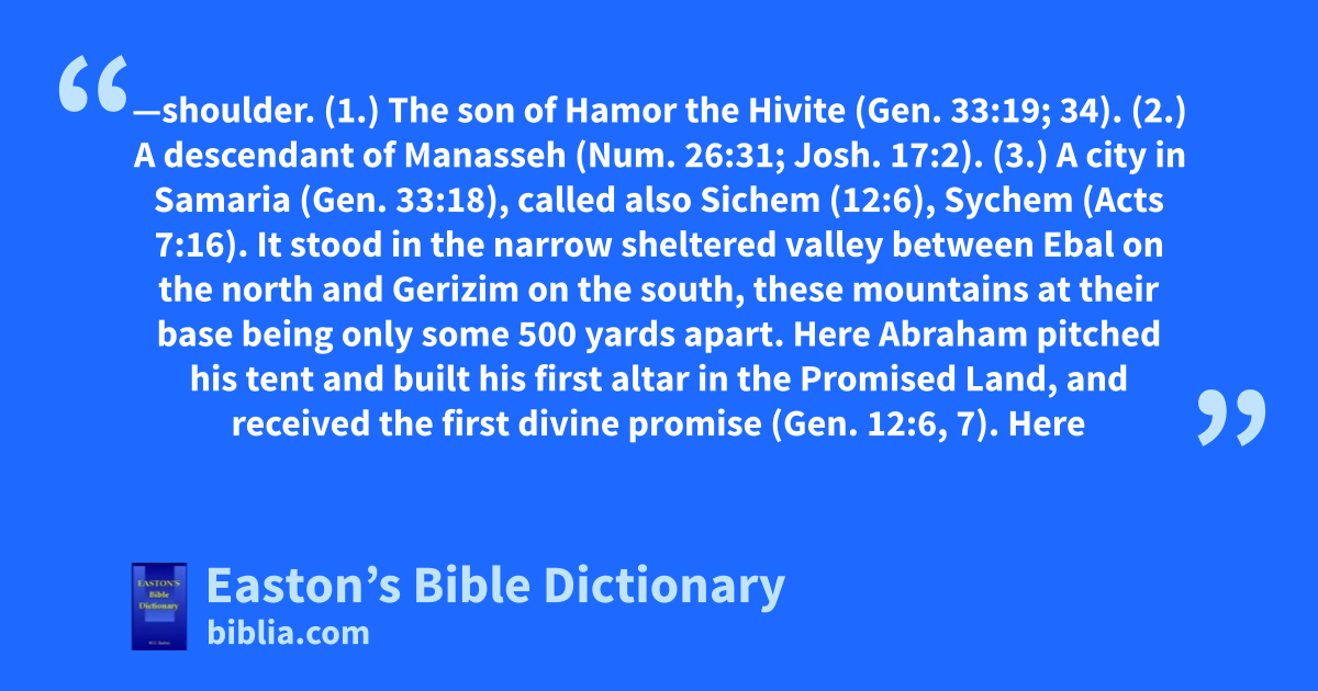 Shechem—shoulder. (1.) The son of Hamor the Hivite (Gen. 33:19; 34).