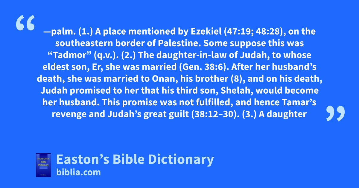 Tamar—palm. (1.) A place mentioned by Ezekiel (47:19; 48:28), on the southeastern border of Palestine. Some suppose this was “Tadmor” (q.v.).