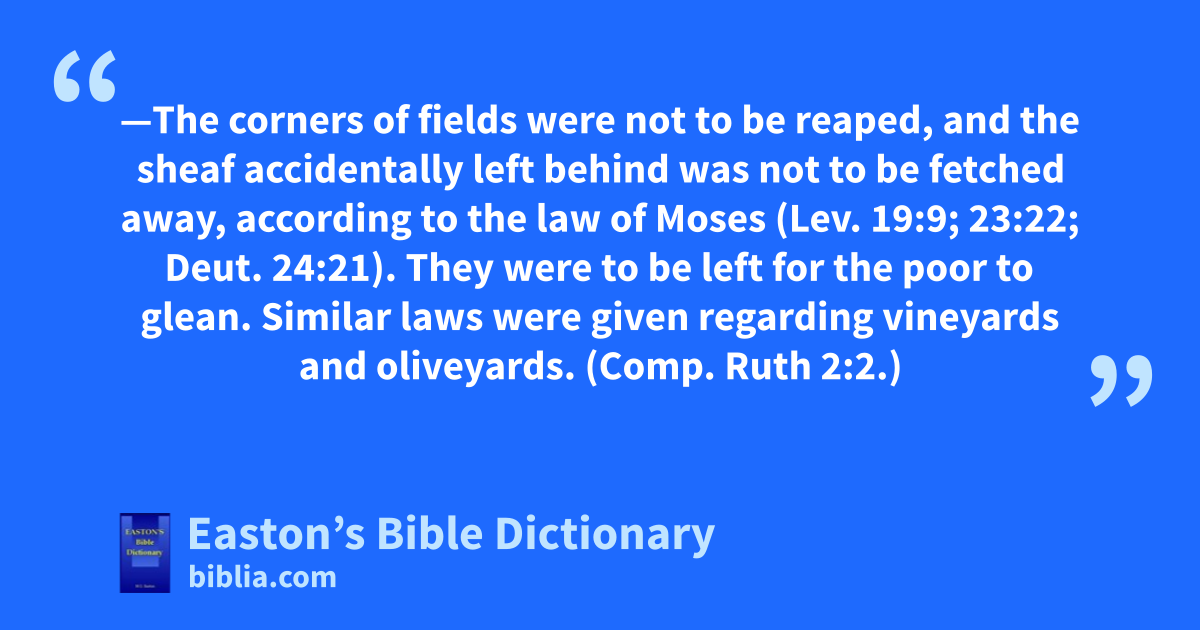 Glean—The corners of fields were not to be reaped, and the sheaf accidentally left behind was not to be fetched away, according to the law of Moses (Lev. 19:9; 23:22; Deut. 24:21). They were to be left for the poor to glean. Similar laws were given regarding vineyards and oliveyards. (Comp. Ruth 2:2.)