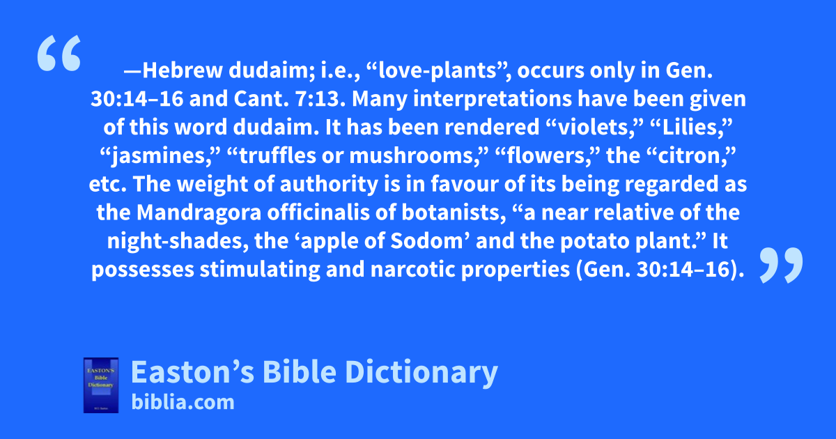 Mandrakes—Hebrew dudaim; i.e., “love-plants”, occurs only in Gen. 30:14–16 and Cant. 7:13. Many interpretations have been given of this word dudaim. It has been rendered “violets,” “Lilies,” “jasmines,” “truffles or mushrooms,” “flowers,” the “citron,” etc. The weight of authority is in favour of its being regarded as the Mandragora officinalis of botanists, “a near relative of the night-shades, the ‘apple of Sodom’ and the potato plant.” It possesses stimulating and narcotic properties (Gen. 30:14–16). The fruit of this plant resembles the potato-apple in size, and is of a pale orange colour. It has been called the “love-apple.” The Arabs call it “Satan’s apple.” It still grows near Jerusalem, and in other parts of Palestine.