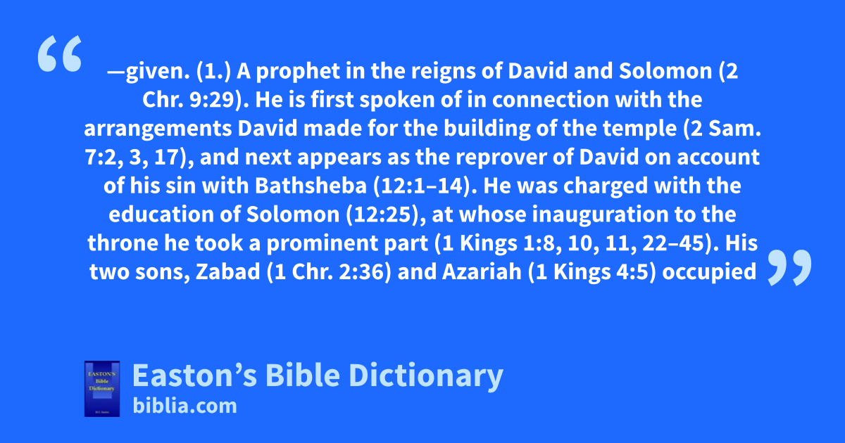 Nathan—given. (1.) A prophet in the reigns of David and Solomon (2 Chr. 9:29). He is first spoken of in connection with the arrangements David made for the building of the temple (2 Sam. 7:2, 3, 17), and next appears as the reprover of David on account of his sin with Bathsheba (12:1–14). He was charged with the education of Solomon (12:25), at whose inauguration to the throne he took a prominent part (1 Kings 1:8, 10, 11, 22–45). His two sons, Zabad (1 Chr. 2:36) and Azariah (1 Kings 4:5) occupied places of honour at the king’s court. He last appears in assisting David in reorganizing the public worship (2 Chr. 29:25). He seems to have written a life of David, and also a life of Solomon (1 Chr. 29:29; 2 Chr. 9:29).