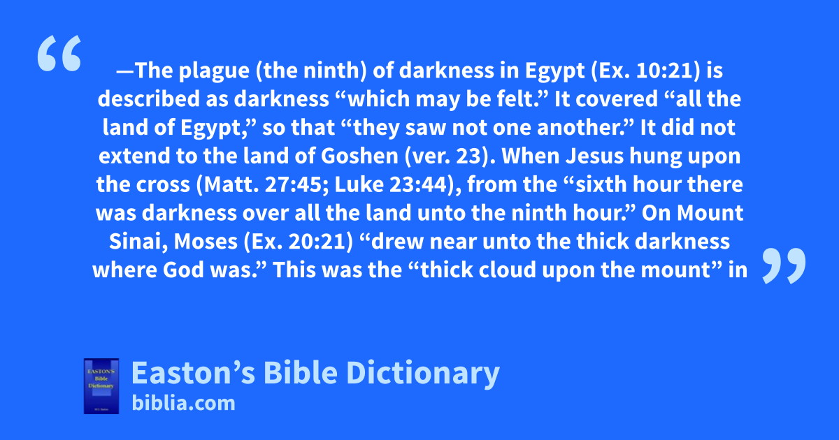 Darkness—The plague (the ninth) of darkness in Egypt (Ex. 10:21) is described as darkness “which may be felt.” It covered “all the land of Egypt,” so that “they saw not one another.” It did not extend to the land of Goshen (ver. 23).