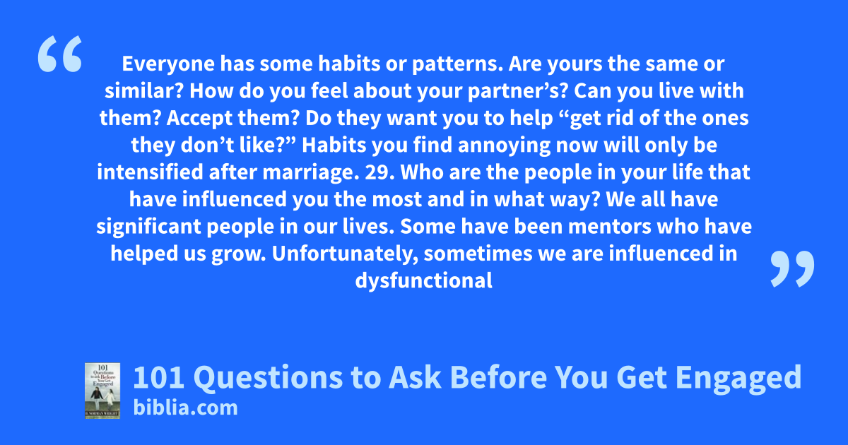 Everyone has some habits or patterns. Are yours the same or similar? How do you feel about your partner’s? Can you live with them? Accept them? Do they want you to help “get rid of the ones they don’t like?” Habits you find annoying now will only be intensified after marriage. 29. Who are the people in your life that have influenced you the most and in what way? We all have significant people in our lives. Some have been mentors who have helped us grow. Unfortunately, sometimes we are influenced in dysfunctional
