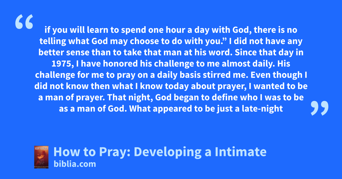 if you will learn to spend one hour a day with God, there is no telling what God may choose to do with you.” I did not have any better sense than to take that man at his word. Since that day in 1975, I have honored his challenge to me almost daily. His challenge for me to pray on a daily basis stirred me. Even though I did not know then what I know today about prayer, I wanted to be a man of prayer. That night, God began to define who I was to be as a man of God. What appeared to be just a late-night