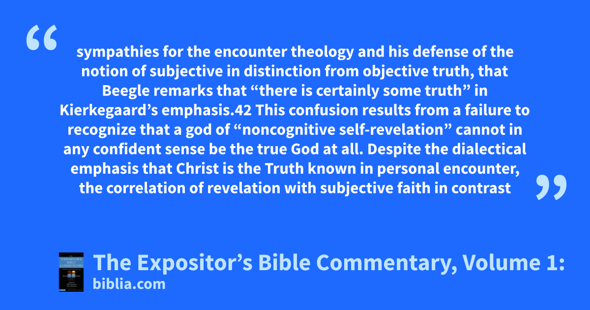 sympathies for the encounter theology and his defense of the notion of subjective in distinction from objective truth, that Beegle remarks that “there is certainly some truth” in Kierkegaard’s emphasis.42 This confusion results from a failure to recognize that a god of “noncognitive self-revelation” cannot in any confident sense be the true God at all. Despite the dialectical emphasis that Christ is the Truth known in personal encounter, the correlation of revelation with subjective faith in contrast