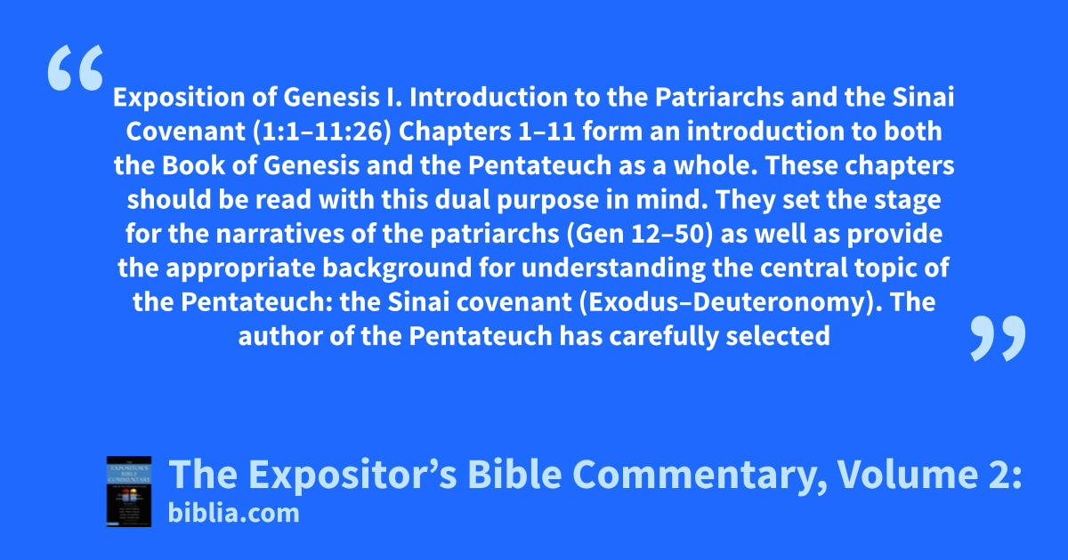 Exposition of Genesis I. Introduction to the Patriarchs and the Sinai Covenant (1:1–11:26) Chapters 1–11 form an introduction to both the Book of Genesis and the Pentateuch as a whole. These chapters should be read with this dual purpose in mind. They set the stage for the narratives of the patriarchs (Gen 12–50) as well as provide the appropriate background for understanding the central topic of the Pentateuch: the Sinai covenant (Exodus–Deuteronomy). The author of the Pentateuch has carefully selected
