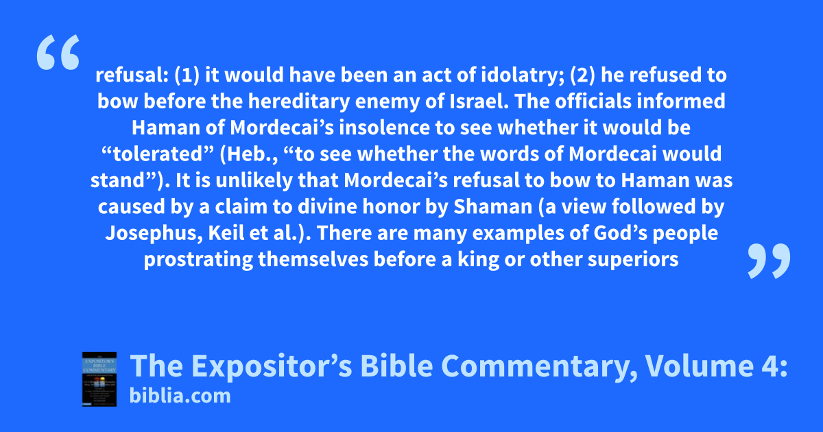 refusal: (1) it would have been an act of idolatry; (2) he refused to bow before the hereditary enemy of Israel. The officials informed Haman of Mordecai’s insolence to see whether it would be “tolerated” (Heb., “to see whether the words of Mordecai would stand”). It is unlikely that Mordecai’s refusal to bow to Haman was caused by a claim to divine honor by Shaman (a view followed by Josephus, Keil et al.). There are many examples of God’s people prostrating themselves before a king or other superiors