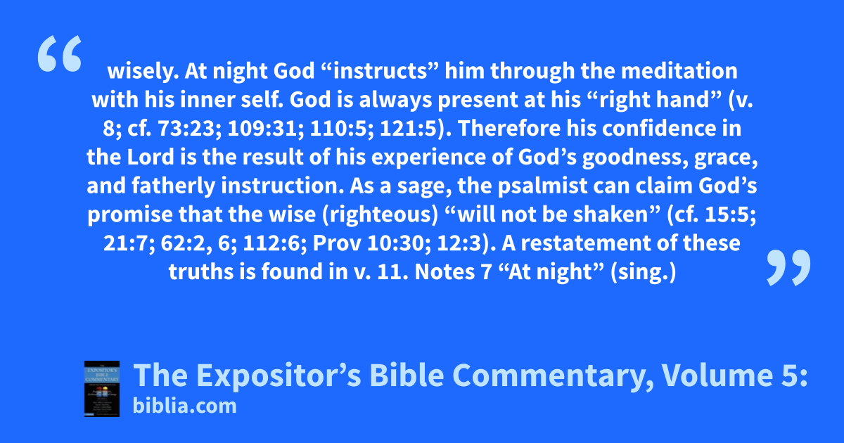 wisely. At night God “instructs” him through the meditation with his inner self. God is always present at his “right hand” (v. 8; cf. 73:23; 109:31; 110:5; 121:5). Therefore his confidence in the Lord is the result of his experience of God’s goodness, grace, and fatherly instruction. As a sage, the psalmist can claim God’s promise that the wise (righteous) “will not be shaken” (cf. 15:5; 21:7; 62:2, 6; 112:6; Prov 10:30; 12:3). A restatement of these truths is found in v. 11. Notes 7 “At night” (sing.)