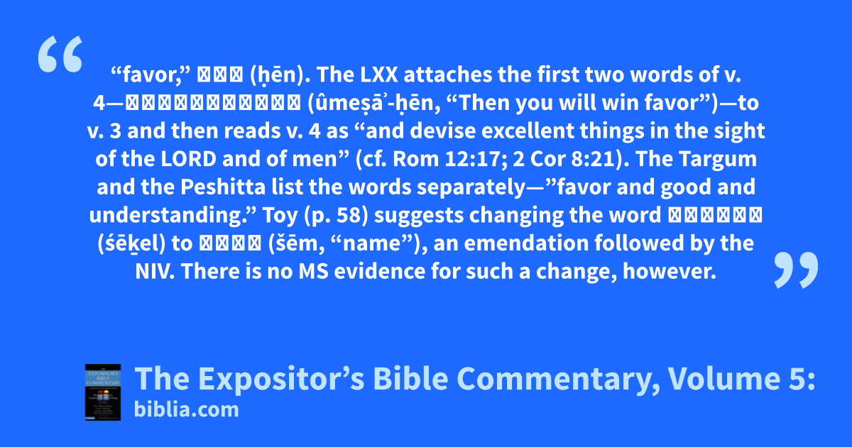 “favor,” חֵן (ḥēn). The LXX attaches the first two words of v. 4—וּמְצָא־חֵן (ûmeṣāʾ-ḥēn, “Then you will win favor”)—to v. 3 and then reads v. 4 as “and devise excellent things in the sight of the LORD and of men” (cf. Rom 12:17; 2 Cor 8:21). The Targum and the Peshitta list the words separately—”favor and good and understanding.” Toy (p. 58) suggests changing the word שֵׂכֶל (śēḵel) to שֵׁם (šēm, “name”), an emendation followed by the NIV. There is no MS evidence for such a change, however.