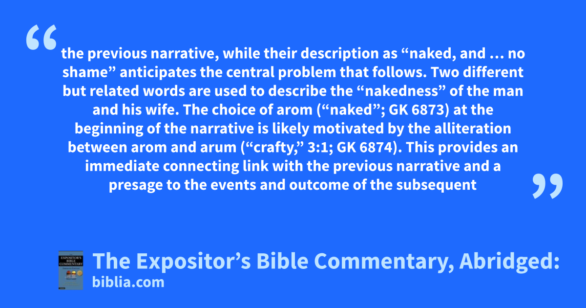 the previous narrative, while their description as “naked, and … no shame” anticipates the central problem that follows. Two different but related words are used to describe the “nakedness” of the man and his wife. The choice of arom (“naked”; GK 6873) at the beginning of the narrative is likely motivated by the alliteration between arom and arum (“crafty,” 3:1; GK 6874). This provides an immediate connecting link with the previous narrative and a presage to the events and outcome of the subsequent