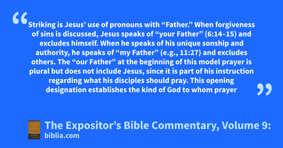 Striking is Jesus’ use of pronouns with “Father.” When forgiveness of sins is discussed, Jesus speaks of “your Father” (6:14–15) and excludes himself. When he speaks of his unique sonship and authority, he speaks of “my Father” (e.g., 11:27) and excludes others. The “our Father” at the beginning of this model prayer is plural but does not include Jesus, since it is part of his instruction regarding what his disciples should pray. This opening designation establishes the kind of God to whom prayer