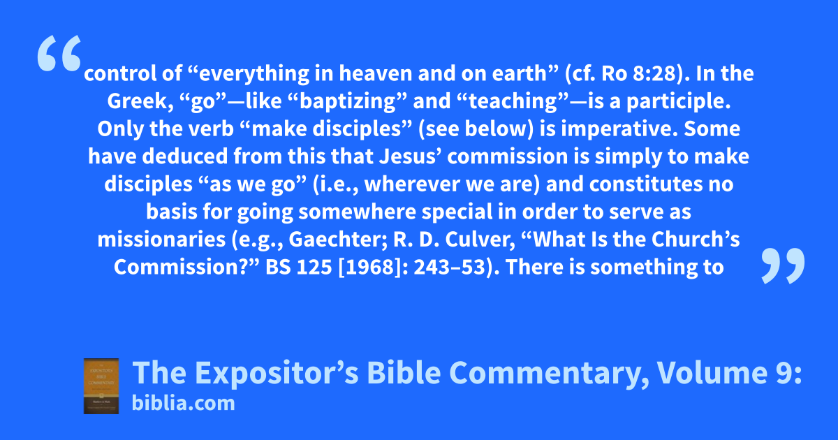 control of “everything in heaven and on earth” (cf. Ro 8:28). In the Greek, “go”—like “baptizing” and “teaching”—is a participle. Only the verb “make disciples” (see below) is imperative. Some have deduced from this that Jesus’ commission is simply to make disciples “as we go” (i.e., wherever we are) and constitutes no basis for going somewhere special in order to serve as missionaries (e.g., Gaechter; R. D. Culver, “What Is the Church’s Commission?” BS 125 [1968]: 243–53). There is something to