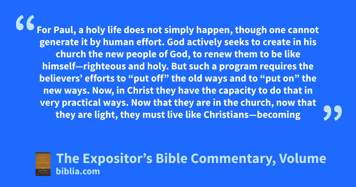 For Paul, a holy life does not simply happen, though one cannot generate it by human effort. God actively seeks to create in his church the new people of God, to renew them to be like himself—righteous and holy. But such a program requires the believers’ efforts to “put off” the old ways and to “put on” the new ways. Now, in Christ they have the capacity to do that in very practical ways. Now that they are in the church, now that they are light, they must live like Christians—becoming
