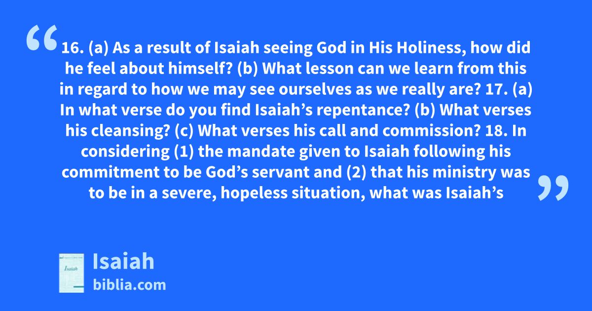 16. (a) As a result of Isaiah seeing God in His Holiness, how did he feel about himself? (b) What lesson can we learn from this in regard to how we may see ourselves as we really are? 17. (a) In what verse do you find Isaiah’s repentance? (b) What verses his cleansing? (c) What verses his call and commission? 18. In considering (1) the mandate given to Isaiah following his commitment to be God’s servant and (2) that his ministry was to be in a severe, hopeless situation, what was Isaiah’s