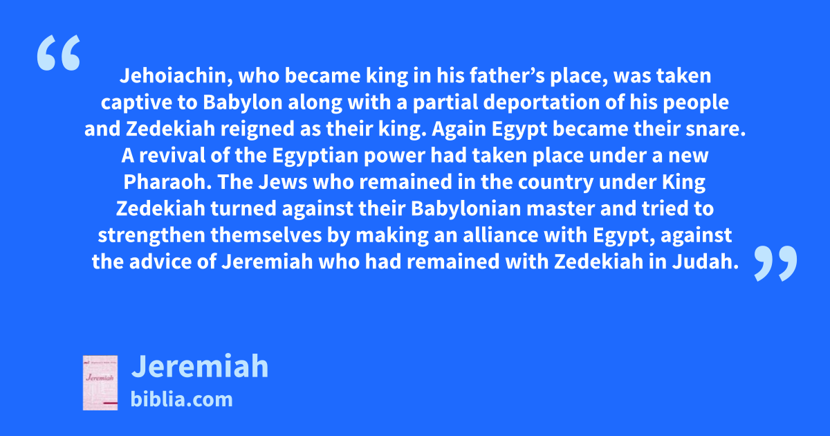 Jehoiachin, who became king in his father’s place, was taken captive to Babylon along with a partial deportation of his people and Zedekiah reigned as their king. Again Egypt became their snare. A revival of the Egyptian power had taken place under a new Pharaoh. The Jews who remained in the country under King Zedekiah turned against their Babylonian master and tried to strengthen themselves by making an alliance with Egypt, against the advice of Jeremiah who had remained with Zedekiah in Judah.