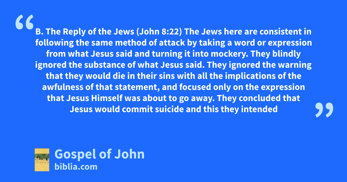 B. The Reply of the Jews (John 8:22) The Jews here are consistent in following the same method of attack by taking a word or expression from what Jesus said and turning it into mockery. They blindly ignored the substance of what Jesus said. They ignored the warning that they would die in their sins with all the implications of the awfulness of that statement, and focused only on the expression that Jesus Himself was about to go away. They concluded that Jesus would commit suicide and this they intended