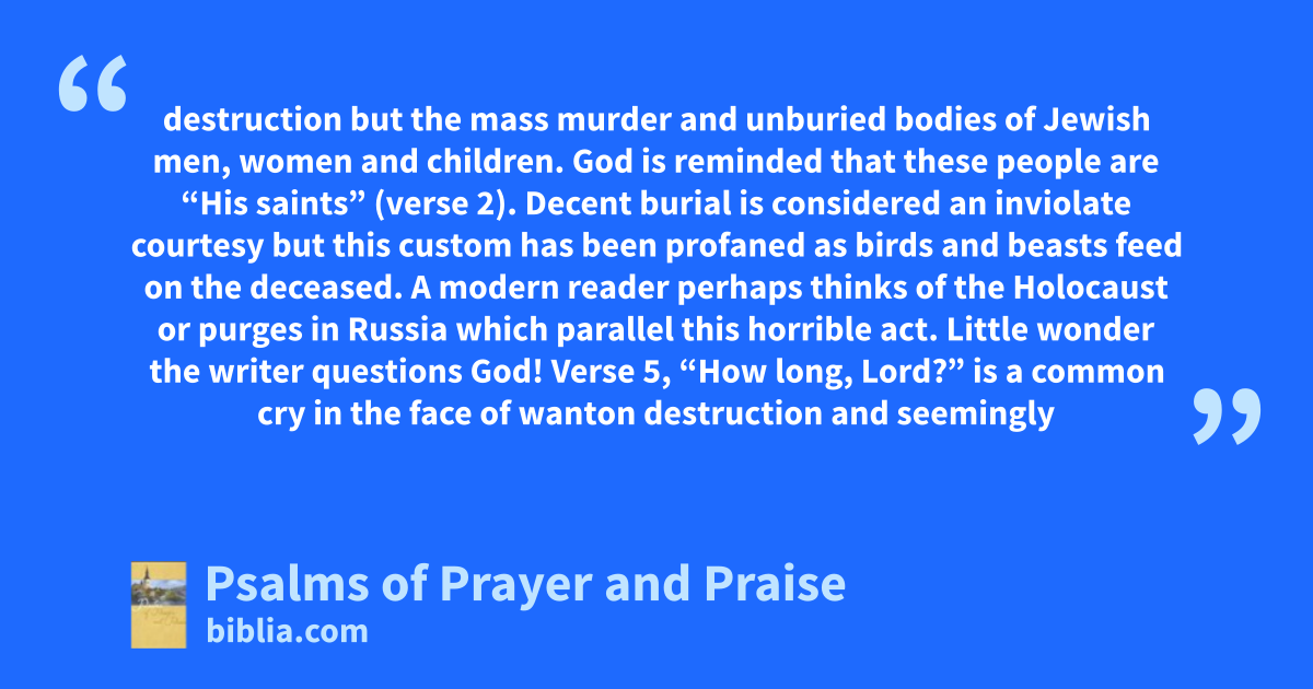 destruction but the mass murder and unburied bodies of Jewish men, women and children. God is reminded that these people are “His saints” (verse 2). Decent burial is considered an inviolate courtesy but this custom has been profaned as birds and beasts feed on the deceased. A modern reader perhaps thinks of the Holocaust or purges in Russia which parallel this horrible act. Little wonder the writer questions God! Verse 5, “How long, Lord?” is a common cry in the face of wanton destruction and seemingly