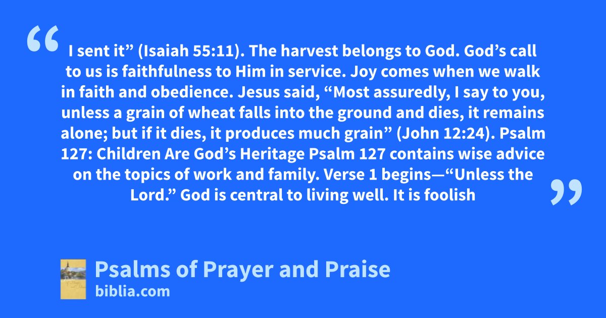 I sent it” (Isaiah 55:11). The harvest belongs to God. God’s call to us is faithfulness to Him in service. Joy comes when we walk in faith and obedience. Jesus said, “Most assuredly, I say to you, unless a grain of wheat falls into the ground and dies, it remains alone; but if it dies, it produces much grain” (John 12:24). Psalm 127: Children Are God’s Heritage Psalm 127 contains wise advice on the topics of work and family. Verse 1 begins—“Unless the Lord.” God is central to living well. It is foolish