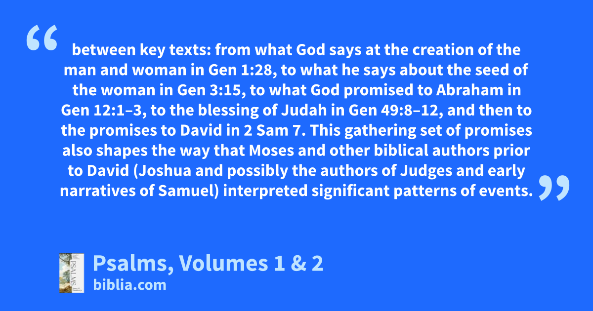 between key texts: from what God says at the creation of the man and woman in Gen 1:28, to what he says about the seed of the woman in Gen 3:15, to what God promised to Abraham in Gen 12:1–3, to the blessing of Judah in Gen 49:8–12, and then to the promises to David in 2 Sam 7. This gathering set of promises also shapes the way that Moses and other biblical authors prior to David (Joshua and possibly the authors of Judges and early narratives of Samuel) interpreted significant patterns of events.