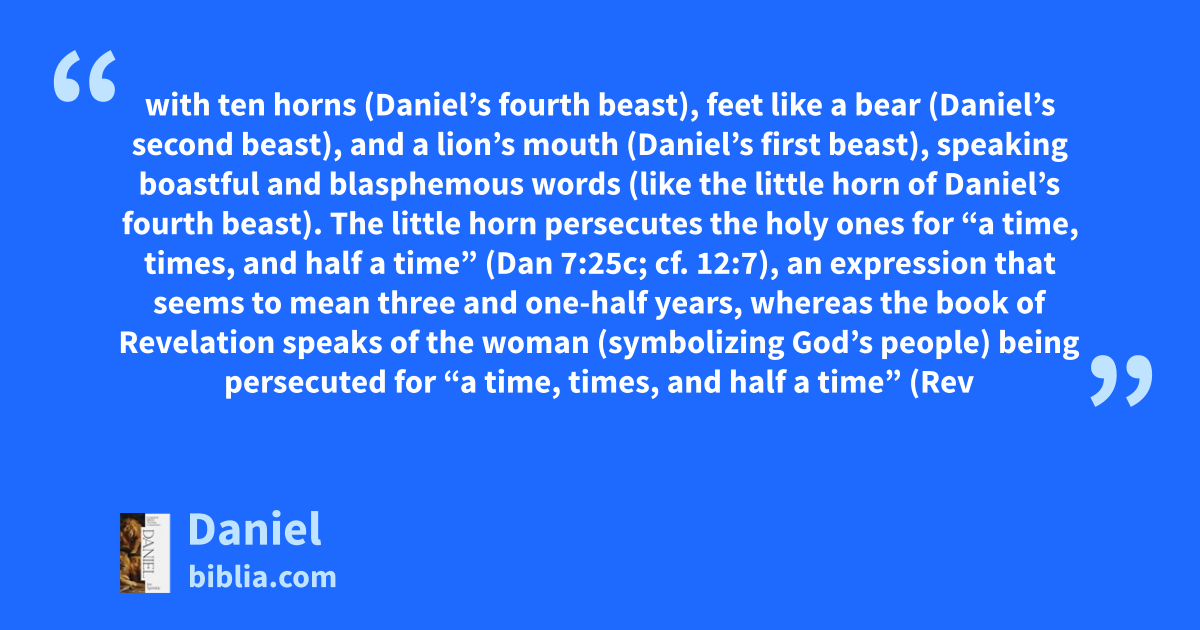 with ten horns (Daniel’s fourth beast), feet like a bear (Daniel’s second beast), and a lion’s mouth (Daniel’s first beast), speaking boastful and blasphemous words (like the little horn of Daniel’s fourth beast). The little horn persecutes the holy ones for “a time, times, and half a time” (Dan 7:25c; cf. 12:7), an expression that seems to mean three and one-half years, whereas the book of Revelation speaks of the woman (symbolizing God’s people) being persecuted for “a time, times, and half a time” (Rev