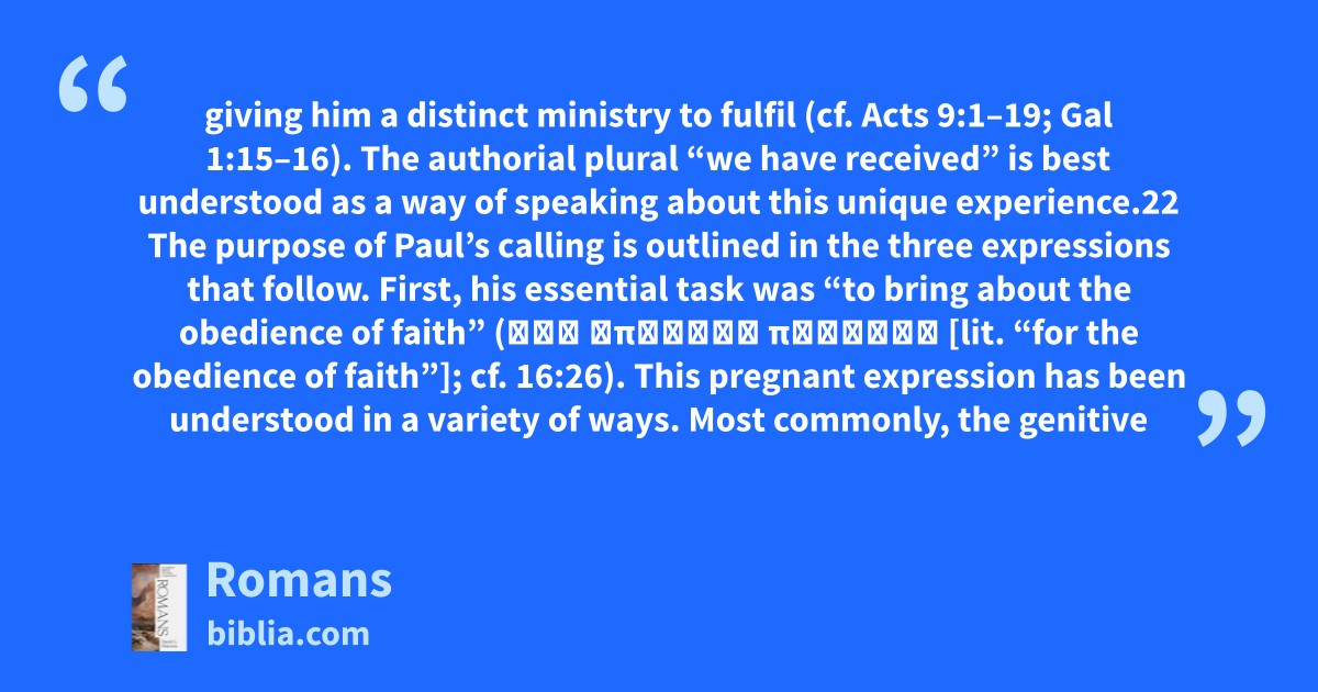 giving him a distinct ministry to fulfil (cf. Acts 9:1–19; Gal 1:15–16). The authorial plural “we have received” is best understood as a way of speaking about this unique experience.22 The purpose of Paul’s calling is outlined in the three expressions that follow. First, his essential task was “to bring about the obedience of faith” (εἰς ὑπακοὴν πίστεως [lit. “for the obedience of faith”]; cf. 16:26). This pregnant expression has been understood in a variety of ways. Most commonly, the genitive